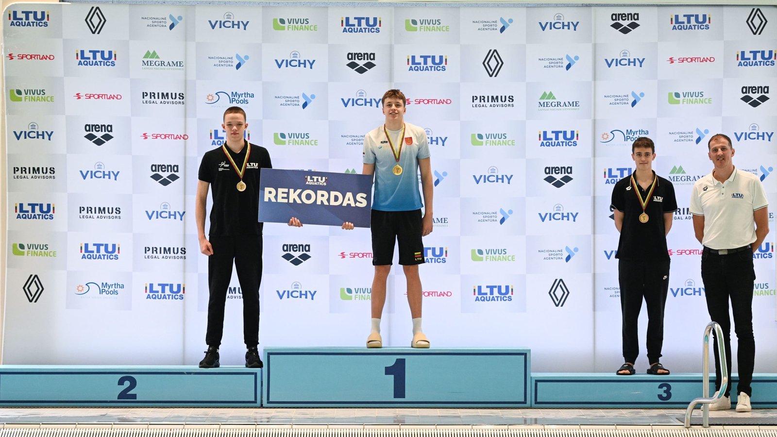 Čempionate jaunajam plaukikui įteiktos trys „LTU Aquatics“ 2023 metų apdovanojimų statulėlės. Priminsime, kad geriausių „LTU Aquatics“ sportininkų rinkimuose T.Juška buvo išrinktas „Metų proveržiu“ ir „Metų rekordininku“.