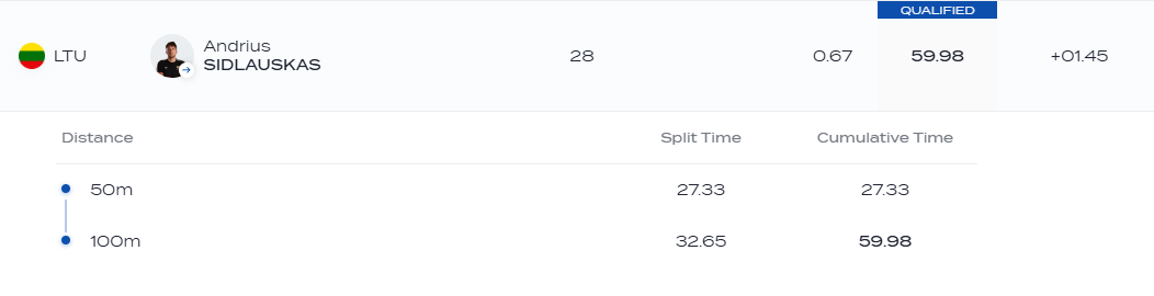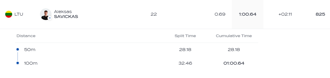 Toje pačioje rungtyje taip pat pasirodė ir Amerikoje besitreniruojantis Aleksas Savickas. Aleksas nuotolį nuplaukė per 1 min. 00,64 sek. ir užėmė 23-ąją vietą.