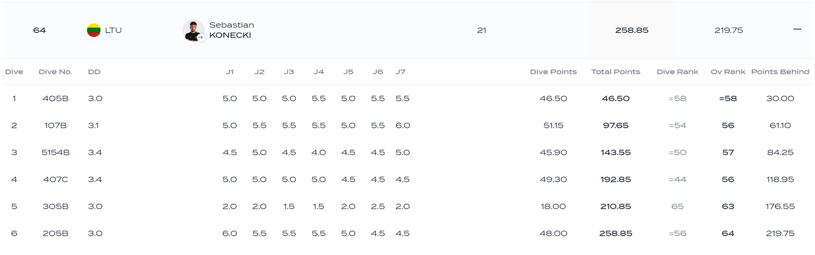 Šiandien savo pasirodymą 2025 m. pasaulio čempionate šiandien baigė Lietuvos šuolininkai į vandenį. Atrankoje pasirodęs Martynas Lisauskas šokinėdamas nuo 3 m tramplyno surinko 344,60 tšk. ir užėmė 36-ąją vietą, o Sebastianas Koneckis – 258,85 tšk. (64-oji vieta).