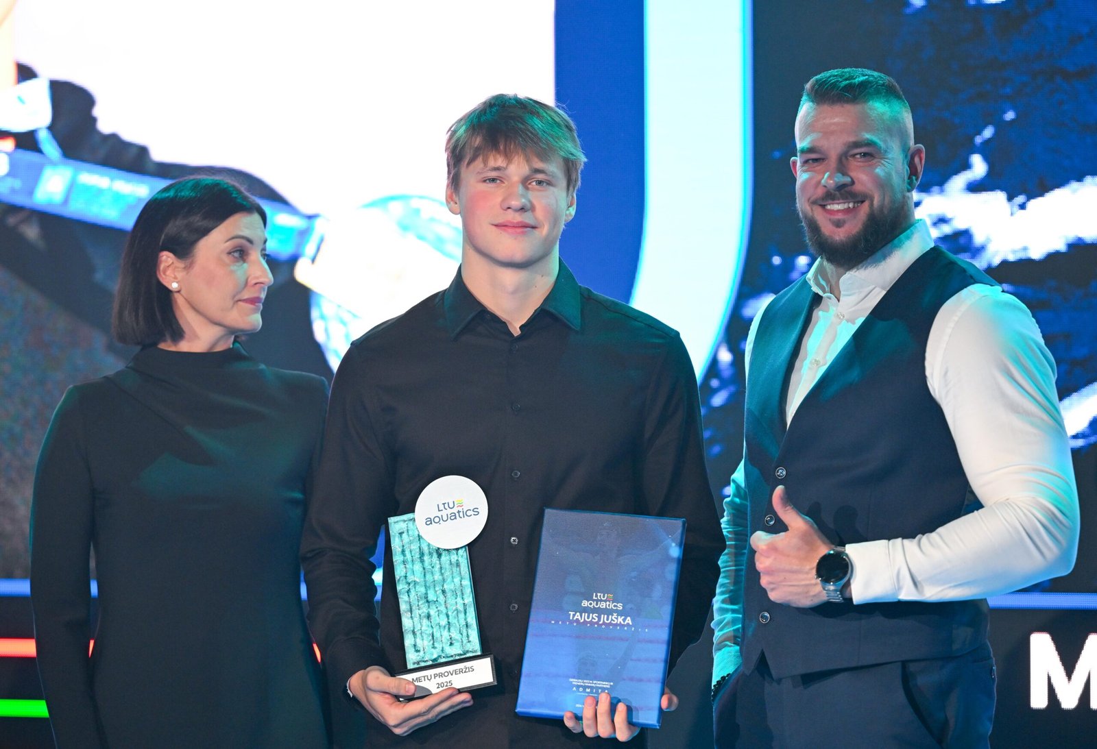 Metų proveržio nominacijoje triumfavo Kauno plaukimo mokyklos sportininkas T. Juška. Pasaulio jaunimo čempiono vardą 2025 m. iškovojęs plaukikas 15min.lt vykusiame balsavime surinko net 53% visuomenės balsų.