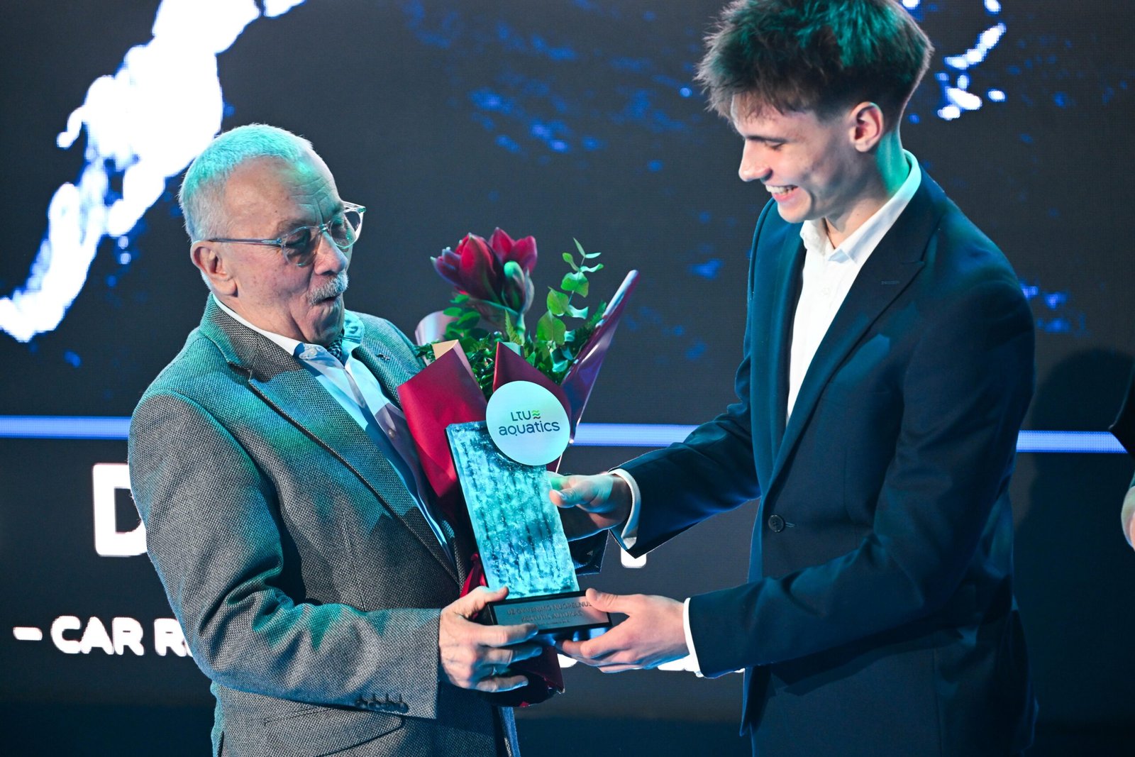 Už viso gyvenimo nuopelnus apdovanotas ir šuolių į vandenį treneris Kęstutis Autukas, jam apdovanojimą įteikė Martynas Lisauskas ir Alė Pikturnienė.