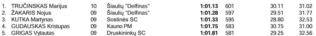 | 200 m krūtine, jaunės | Patricija Kupstaitė (2 min. 38,75 sek.) | Auksė Arnytė (2 min. 39,00 sek.) | Irūna Zelenkaitė (2 min. 47,49 sek.) |