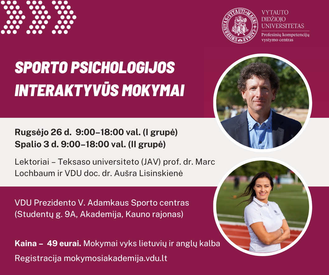 Kaip pagerinti sportininkų rezultatus, psichologinį pasirengimą ir jų motyvaciją? Rugsėjo 26 d. (I grupė) arba spalio 3 d. (II grupė) 9:00–18:00 val. sporto trenerius, sportininkus, pedagogus kviečiame dalyvauti mokymuose tema „Sporto psichologijos interaktyvūs mokymai“. Juose bus pristatyta, kaip sporto psichologijos žinios ir įvairūs metodai gali padėti sportininkams, treneriams ir net sportininkų artimiesiems paskatinti sportininkų potencialą, pagerinti sporto rezultatus ir išlaikyti psichologinę gerovę. Mokymai vyks lietuvių ir anglų kalba.