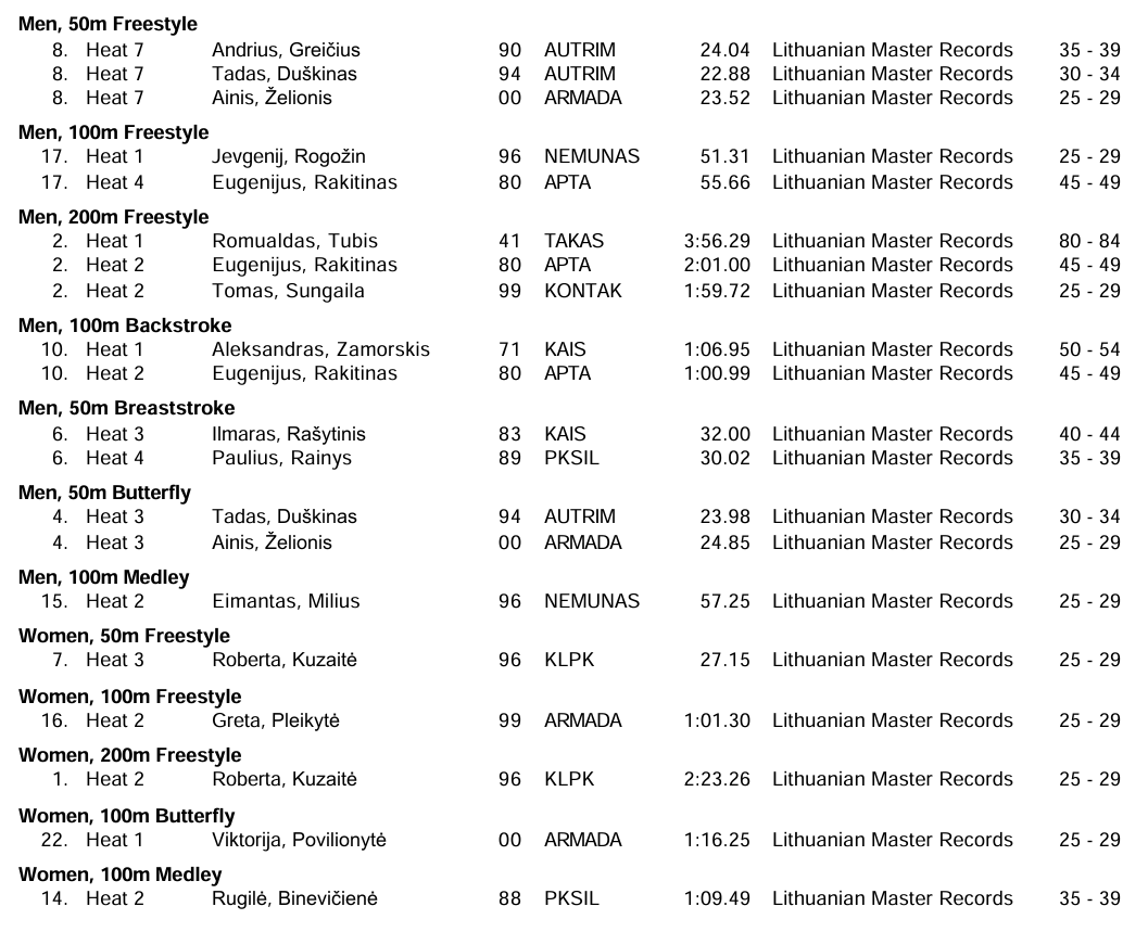 25 m. ir vyresni plaukimo meistrai Druskininkuose varžėsi ne tik dėl apdovanojimų, bet ir gerino šalies rekordus savo amžiaus grupėse. Lietuvos meistrų rekordus pagerinę plaukikai gavo po atminimo medalį.
