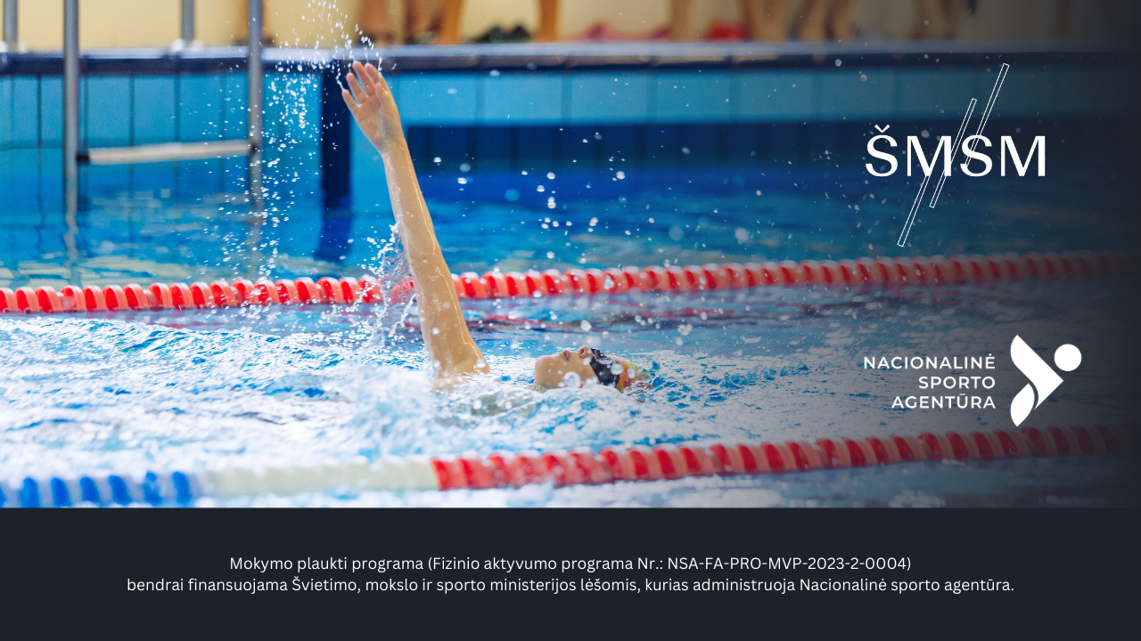 | 1 pamoka | 1. Pasakojimas apie plaukimo sporto šaką ir pramogas vandenyje. 2. Supažindinimas su saugaus elgesio taisyklėmis baseino patalpose ir vandenyje, asmens higiena. 3. Parengiamieji pratimai vandenyje. |