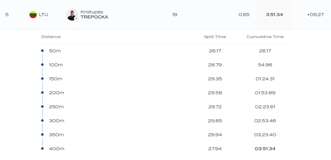 Panevėžietis K. Trepočka startavo pirmasis: 400 m laisvu stiliumi 19-metis nuplaukė per 3 min. 51,34 sek., taip pagerindamas savo asmeninį rekordą. Kristupas užėmė 30-ąją vietą.