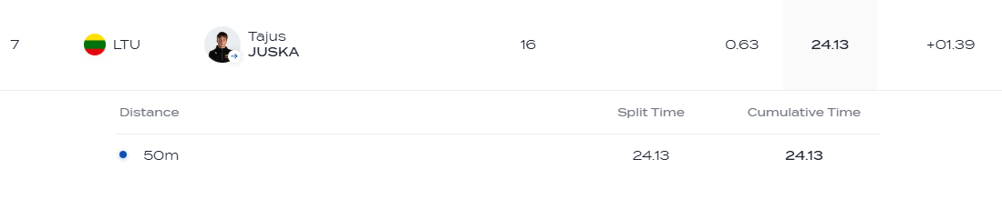Visai netrukus baseine lenktyniavo ir 50 m peteliške plaukęs T. Juška. Tajus sprinto distanciją įveikė per 24,13 sek. (karjeros rekordas – 23,76 sek.). Kaunietis šioje rungtyje aplenkė daugiau nei pusšimtį sportininkų ir užėmė 43-ąją vietą.
