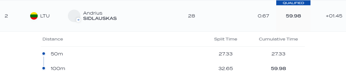 Savo ruožtu A. Šidlauskas į pusfinalį pateko 15-tu rezultatu, 100 m krūtine nuplaukęs per 59,98 sek.