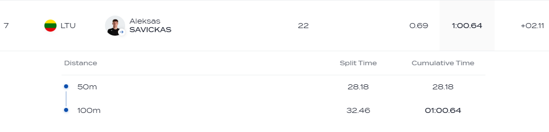 Toje pačioje rungtyje taip pat pasirodė ir Amerikoje besitreniruojantis Aleksas Savickas. Aleksas nuotolį nuplaukė per 1 min. 00,64 sek. ir užėmė 23-ąją vietą.