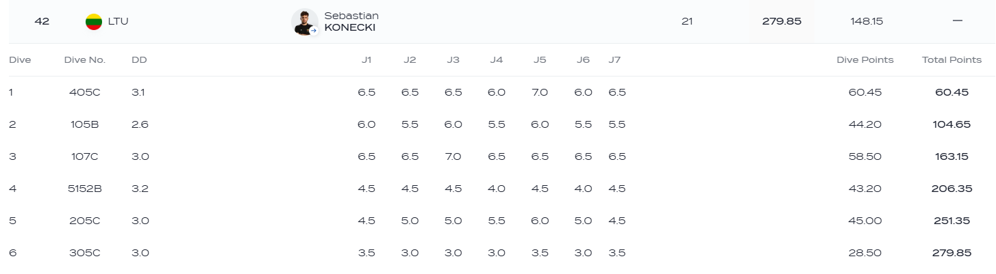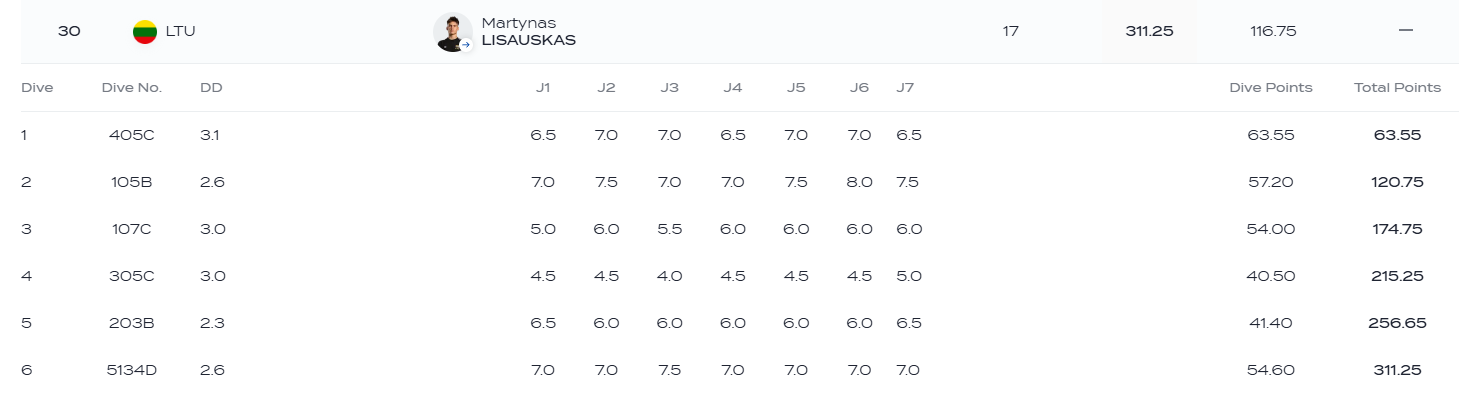 Pirmąją šuolių į vandenį nuo 1 m tramplino programą sekmadienį atliko abu Lietuvos šuolininkai. Martynas Lisauskas, surinkęs 311,25 taškų, užėmė 30-ąją vietą, o Sebastianas Konecki – 42-ą. Iš viso šioje rungtyje dalyvavo 60 sportininkų.