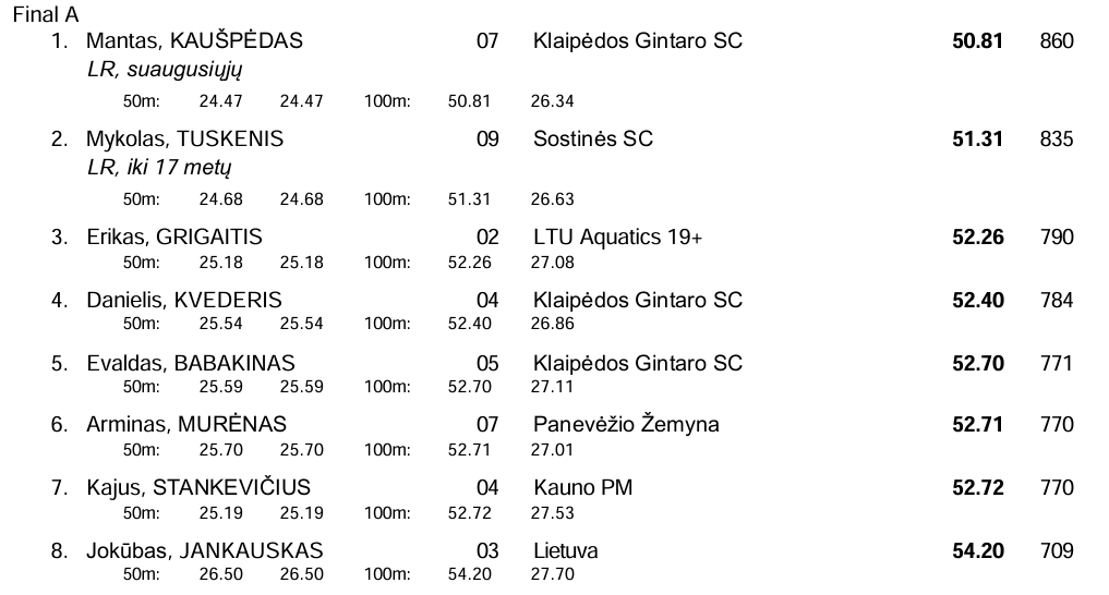 100 m nugara finale Mykolas Tuskenis gerino Lietuvos rekordą iki 17 metų, tačiau tai nesutrukdė Mantui Kaušpėdui iškovoti aukso medalio ir pagerinti dešimtmetį gyvavusį Dano Rapšio Lietuvos rekordą. Klaipėdietis distanciją nuplaukė per 50,81 sek., sidabro medalį pelnė amžiaus grupės rekordą gerinęs M. Tuskenis (51,31 sek.), o bronza atiteko Erikui Grigaičiui (52,26 sek.).