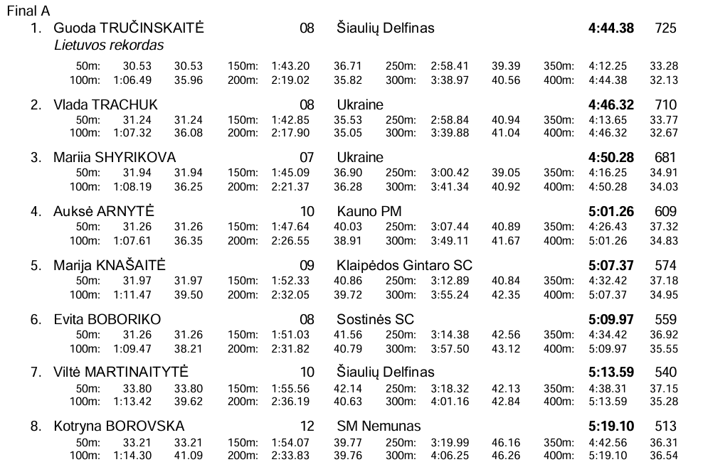 Antrąją „Green Feel’s“ Lietuvos plaukimo čempionato dieną Guoda Tručinskaitė pranoko jai pačiai priklausantį Lietuvos rekordą. Šiaulietė 400 m kompleksiniu būdu nuplaukė per 4 min. 44,38 sek. iškovojo auksą ir daugiau nei sekunde pagerino savo asmeninį rezultatą, kuris yra ir naujasis Lietuvos rekordas.