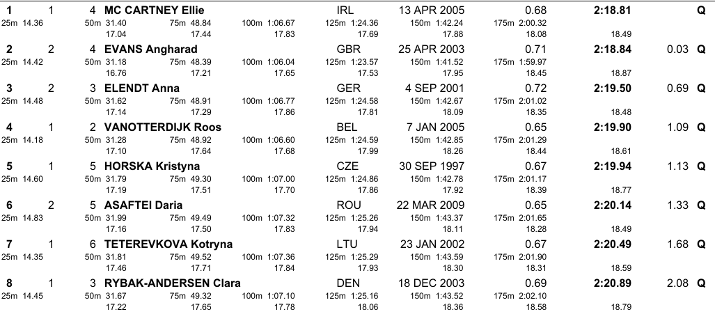 Ketvirtadienį ryte aštuntu rezultatu į 200 m pusfinalius įplaukusi Kotryna Teterevkova tempo nemažino ir vakare – nuo savo asmeninio ir kartu Lietuvos rekordo vilnietė vakare atsiliko vos 0,01 sek. K. Teterevkova pusfinalyje distanciją įveikė per 2 min. 20,49 sek. ir septintu rezultatu pateko į rytoj vyksiantį finalą. Pusfinaliuose greičiausia buvo airė Ellie Mc Cartney (2 min. 18,81 sek.).