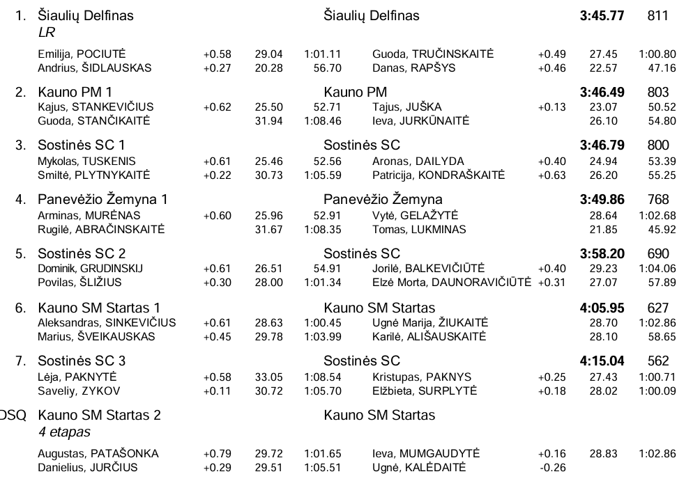 Rungties vicečempionais tapo Kauno plaukimo mokyklos komanda (Kajus Stankevičius, Guoda Stančikaitė, T. Juška ir I. Jurkūnaitė), o bronza atiteko Sostinės SC pirmajai komandai (M. Tuskenis, S. Plytnykaitė, Aronas Dailyda, Patricija Kondraškaitė).