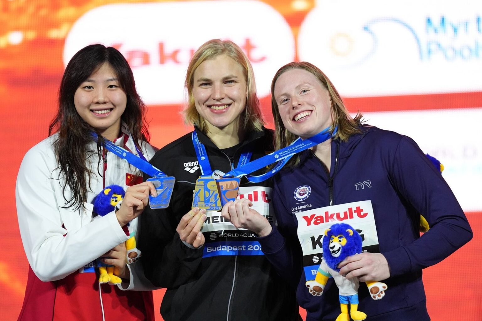 Tang Qianting, Rūta Meilutytė ir Lilly King / Istvan Derencsenyi/World Aquatics nuotr.