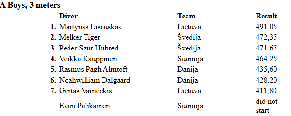 | Martynas Lisauskas | 3 m tramplynas | A grupė | Auksas |