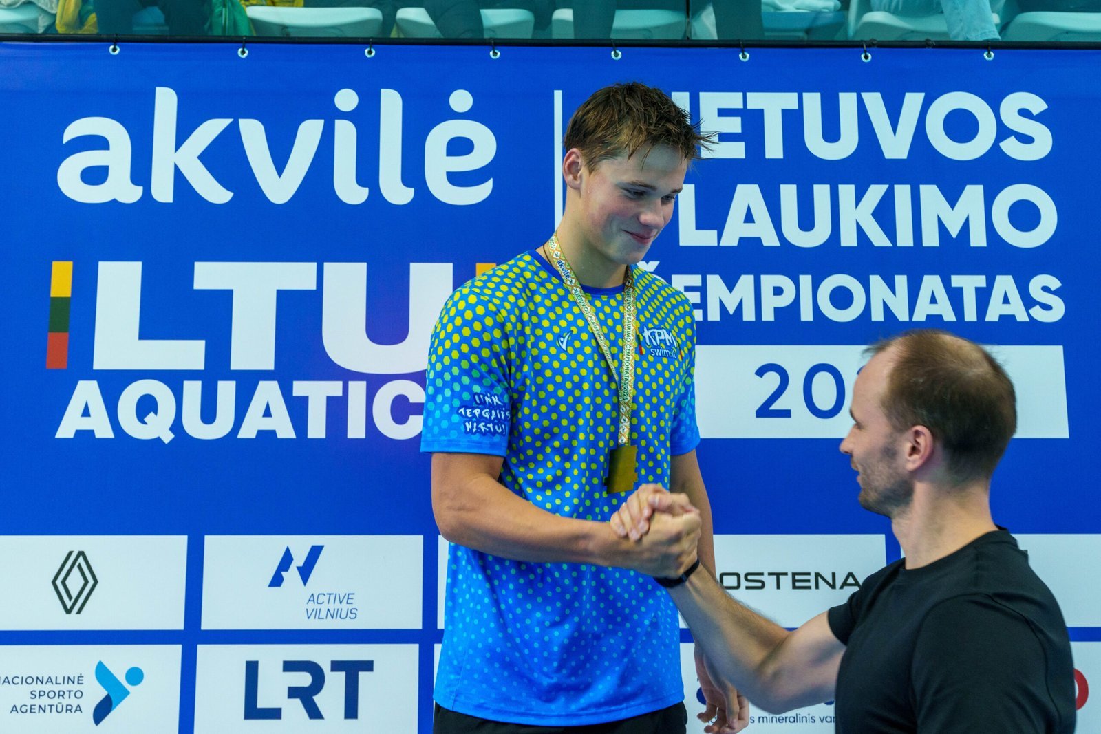Intriguojanti kova laukė ir tarp į Lietuvą iš Didžiosios Britanijos šioms varžyboms grįžusio Manto Kaušpėdo bei „LTU Aquatics“ 19+ atstovo Eriko Grigaičio. Tiesa, 100 metrų nugara plaukęs M. Kaušpėdas jau pirmąją 50 metrų atkarpą įveikė beveik sekunde greičiau nei artimiausias varžovas. Lietuvos amžiaus grupės iki 17 metų rekordininkas atstumą įveikė per 54,46 sek., iškovojo „Akvilė“ Lietuvos plaukimo čempionato aukso medalį ir įvykdė pasaulio jaunimo čempionato normatyvą.