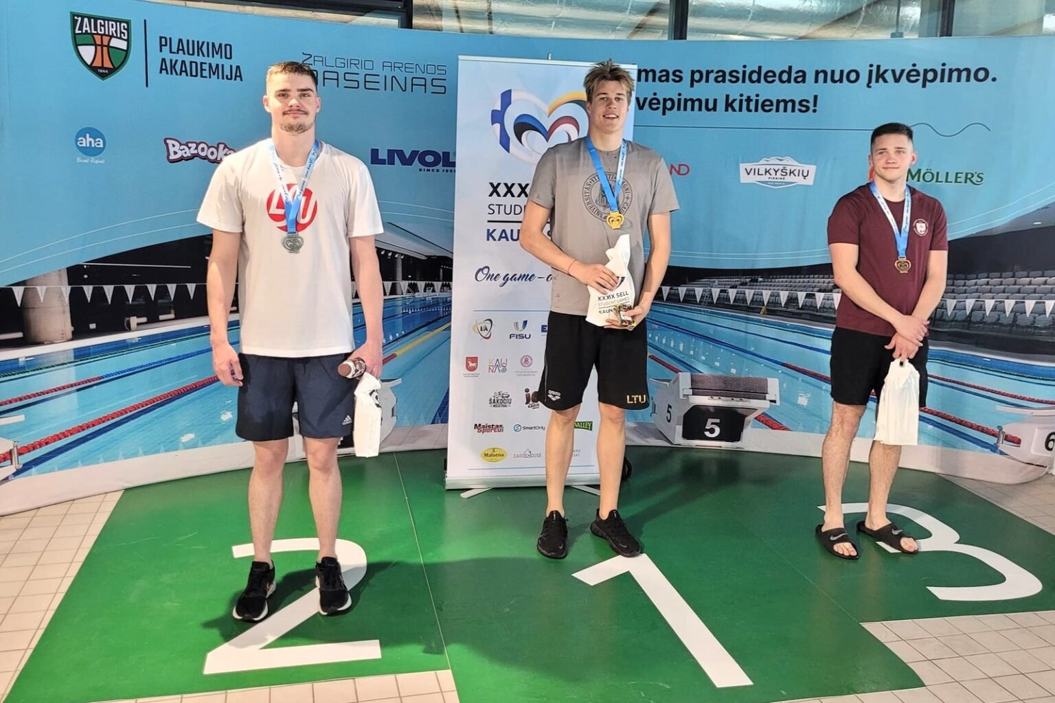 Visi trys plaukimo varžybose dalyvavę VDU plaukikai pelnė apdovanojimus: Kajus Stankevičius iškovojo du aukso medalius (50 m nugara – 26.53 ir 100 m nugara – 56.87), Povilas Strazdas aukso medalį pelnė 200 m kompleksiniame plaukime (2:15.54), o Tautvydas Sutkus bronzą pridėjo 100 m plaukime laisvu stiliumi (53.52).
